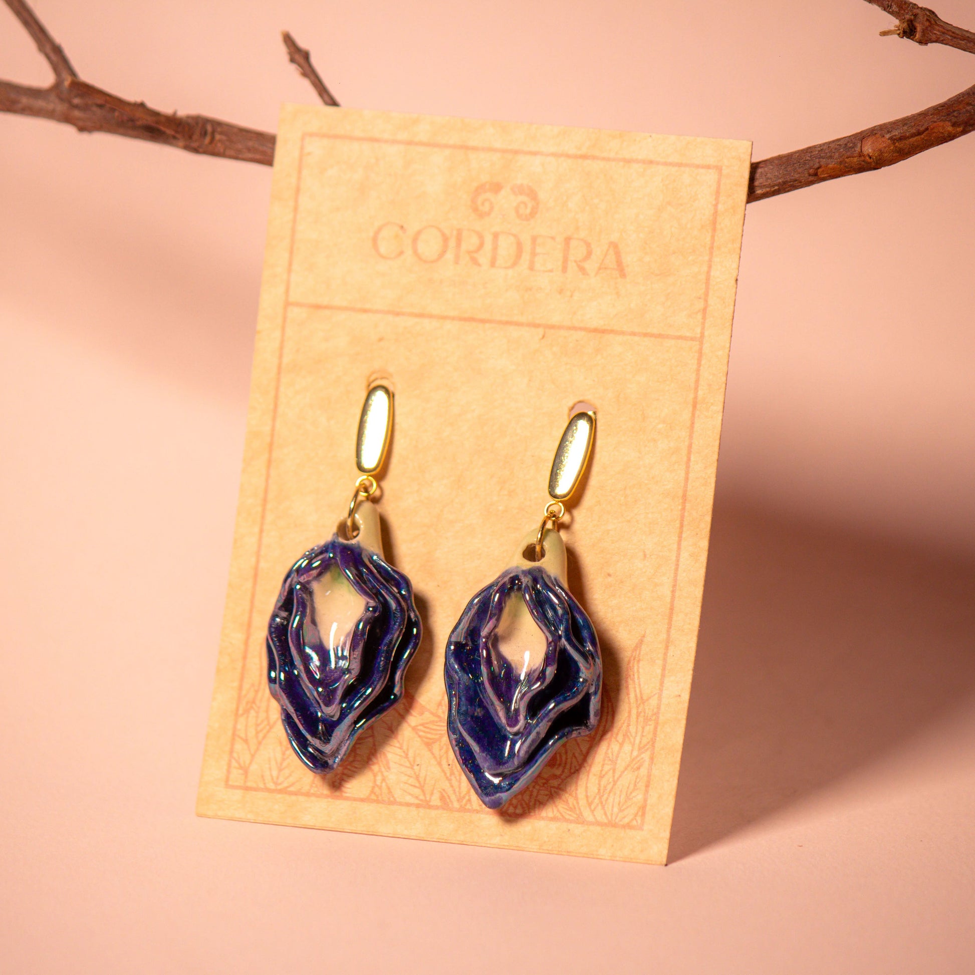 Materiales: cerámica artesanal esmaltada a mano + aro/fornitura en acero inoxidable dorado.