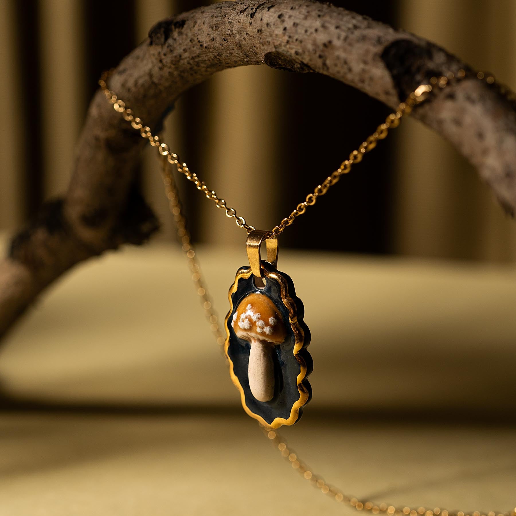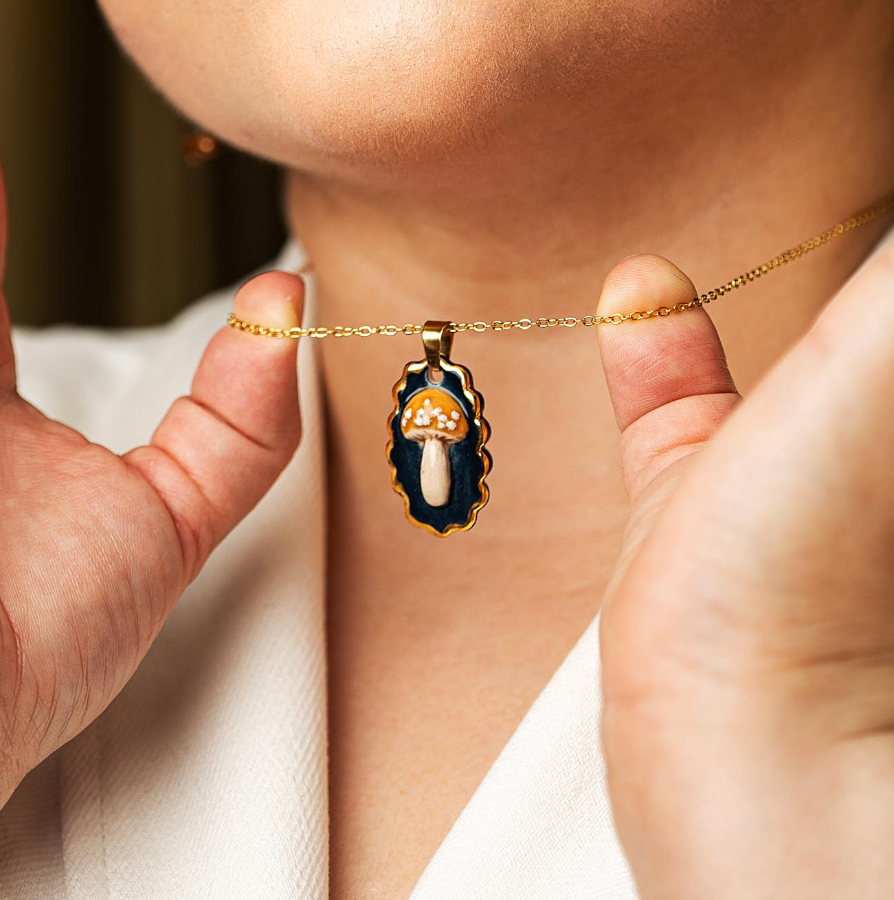 - Materiales: cerámica artesanal esmaltada a mano + cadena en acero inoxidable dorada.