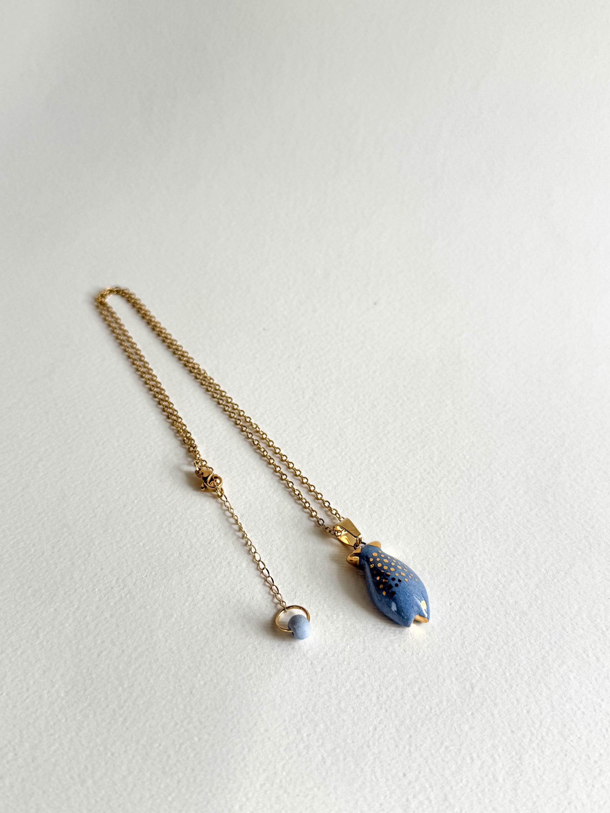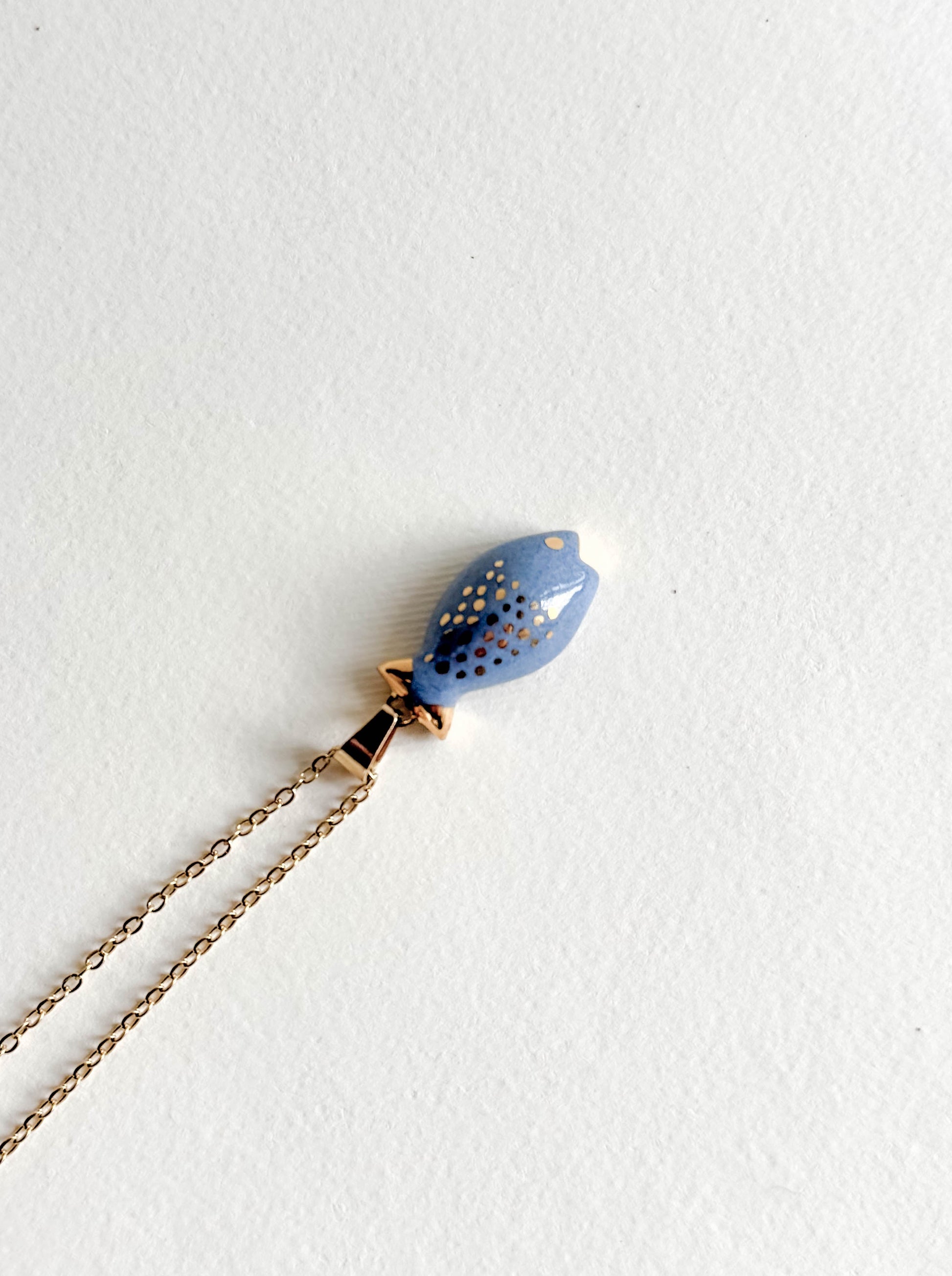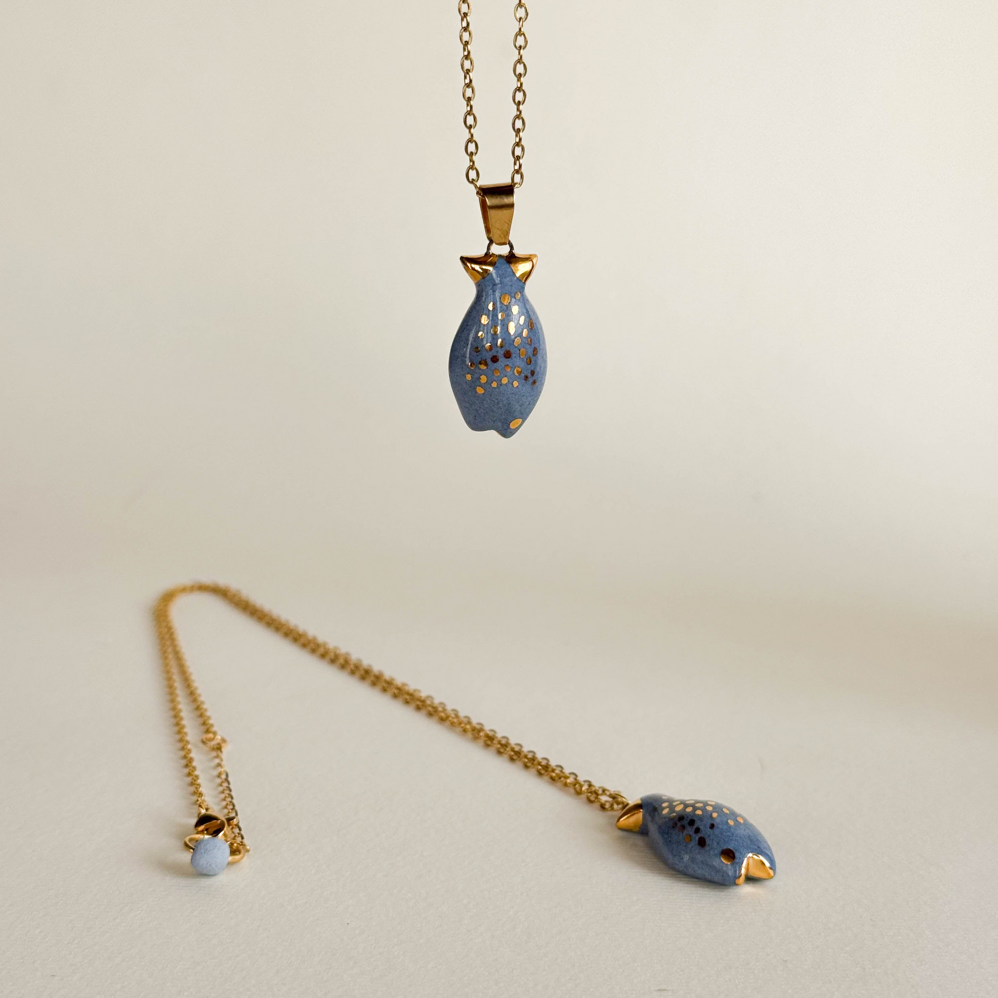 Pieza realizada a mano con detalles en oro y colgando de una cadena de acero inoxidable ✨